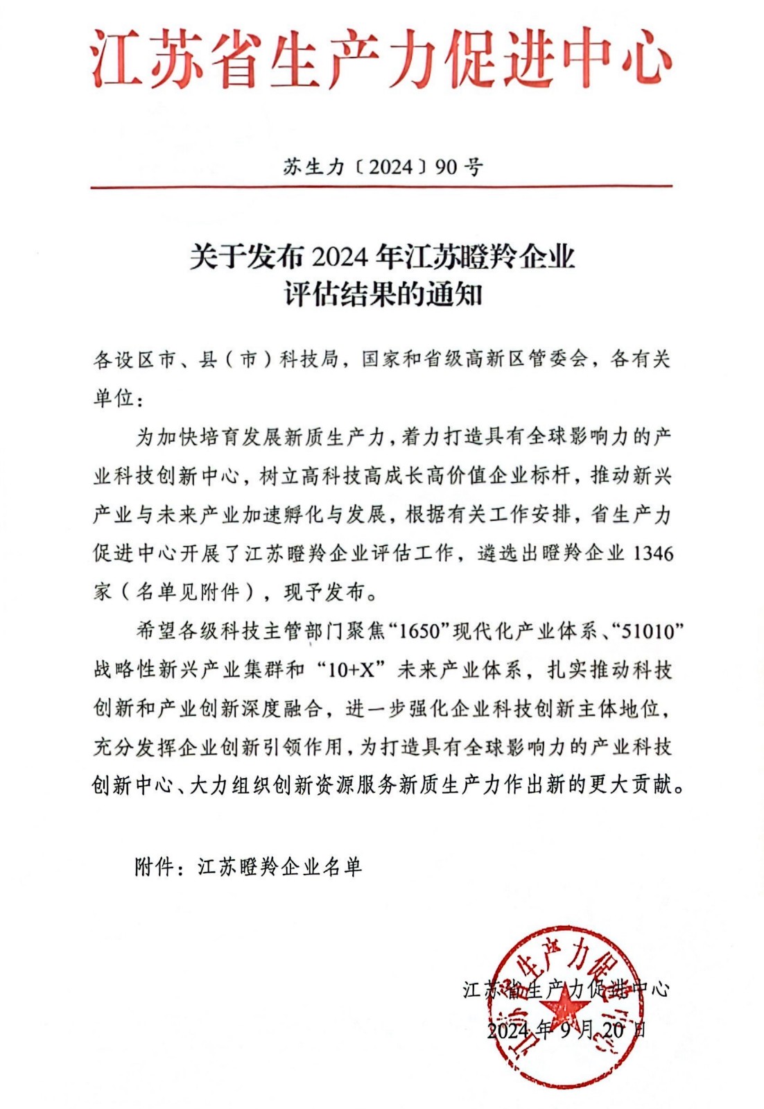 2024年9月,省生產(chǎn)力促進(jìn)中心發(fā)布2024年度江蘇瞪羚企業(yè)評(píng)估結(jié)果,江蘇金智達(dá)新材料有限公司憑借創(chuàng)新能力和市場潛力,榮耀入選。