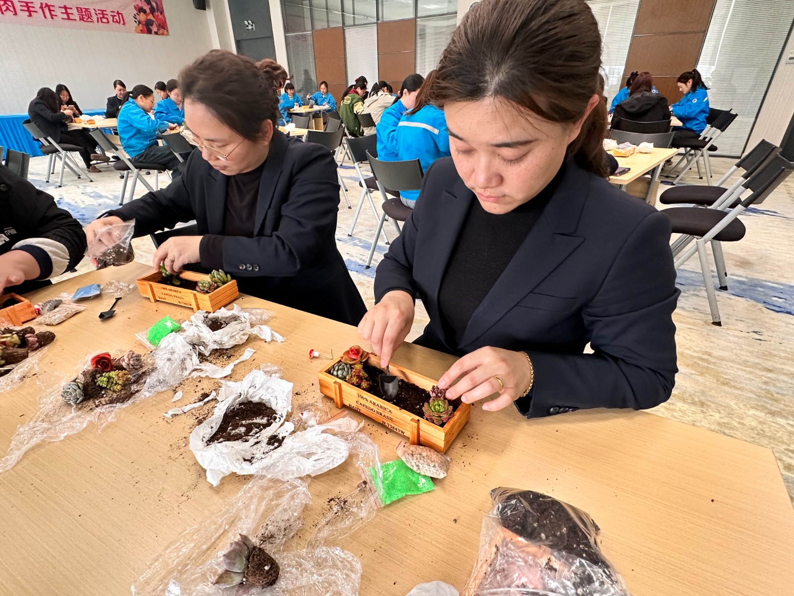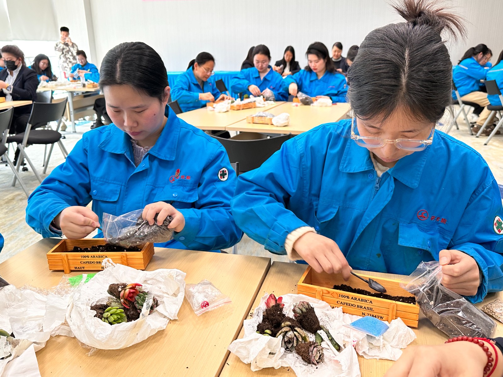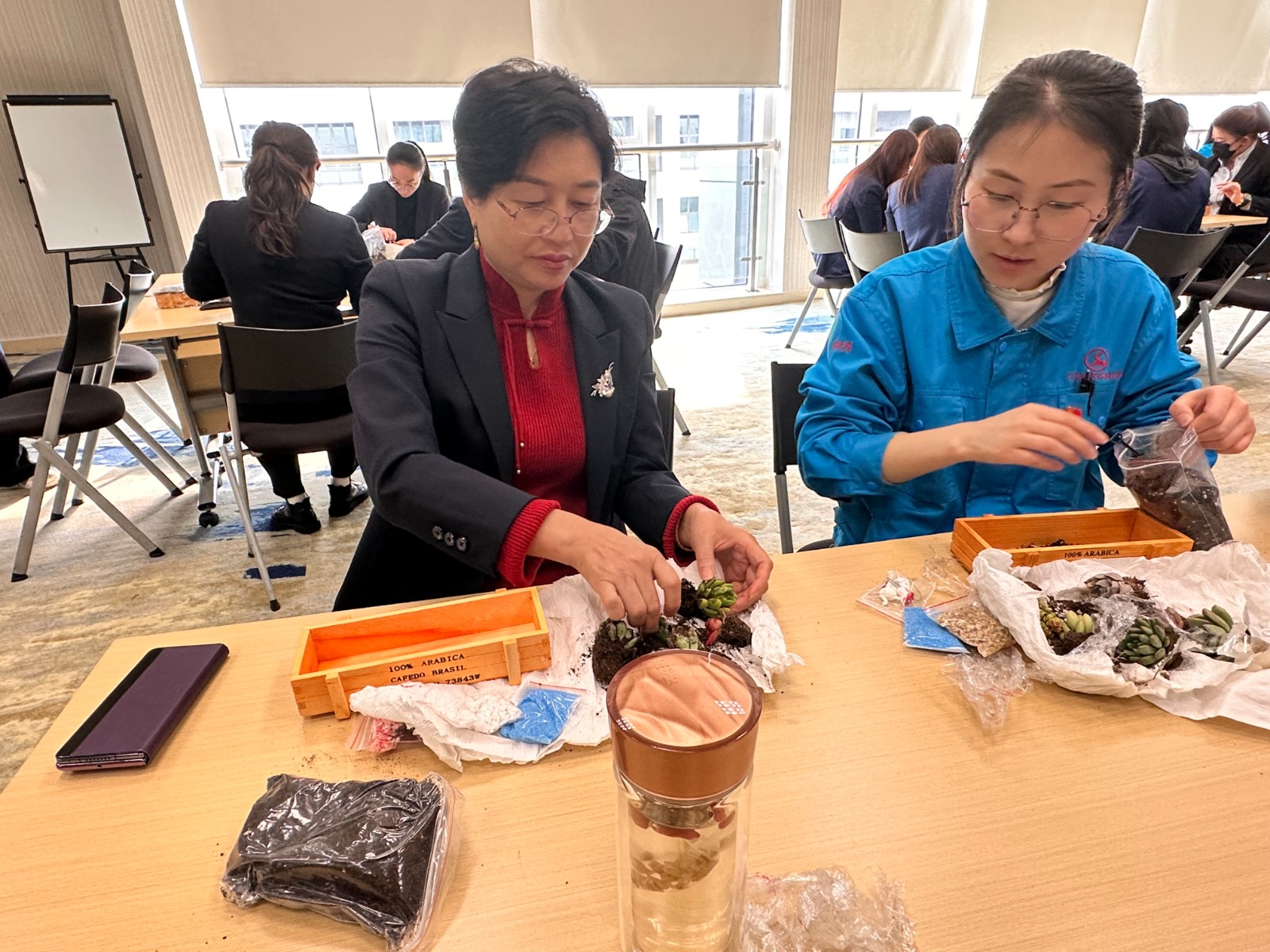 活動現場,集團502會議室搖身一變,成為了一片生機勃勃的綠意天地。在專業(yè)老師的指導下,大家化身園藝小達人,從挑選心儀的多肉品種到巧妙搭配色彩與造型,再到親手將這些“小可愛”栽種進精致的花盆,每一道工序都充滿了創(chuàng)意與樂趣。