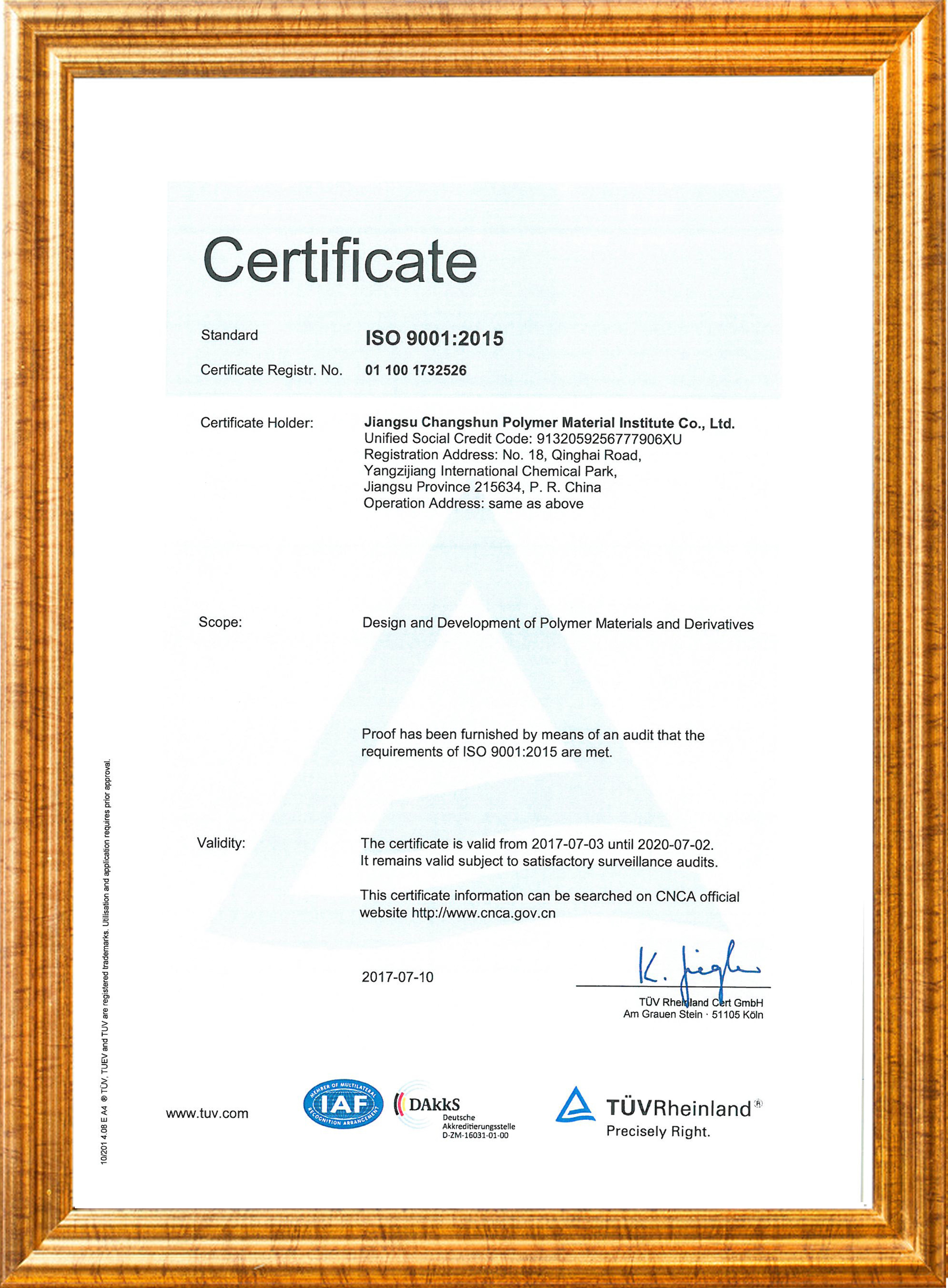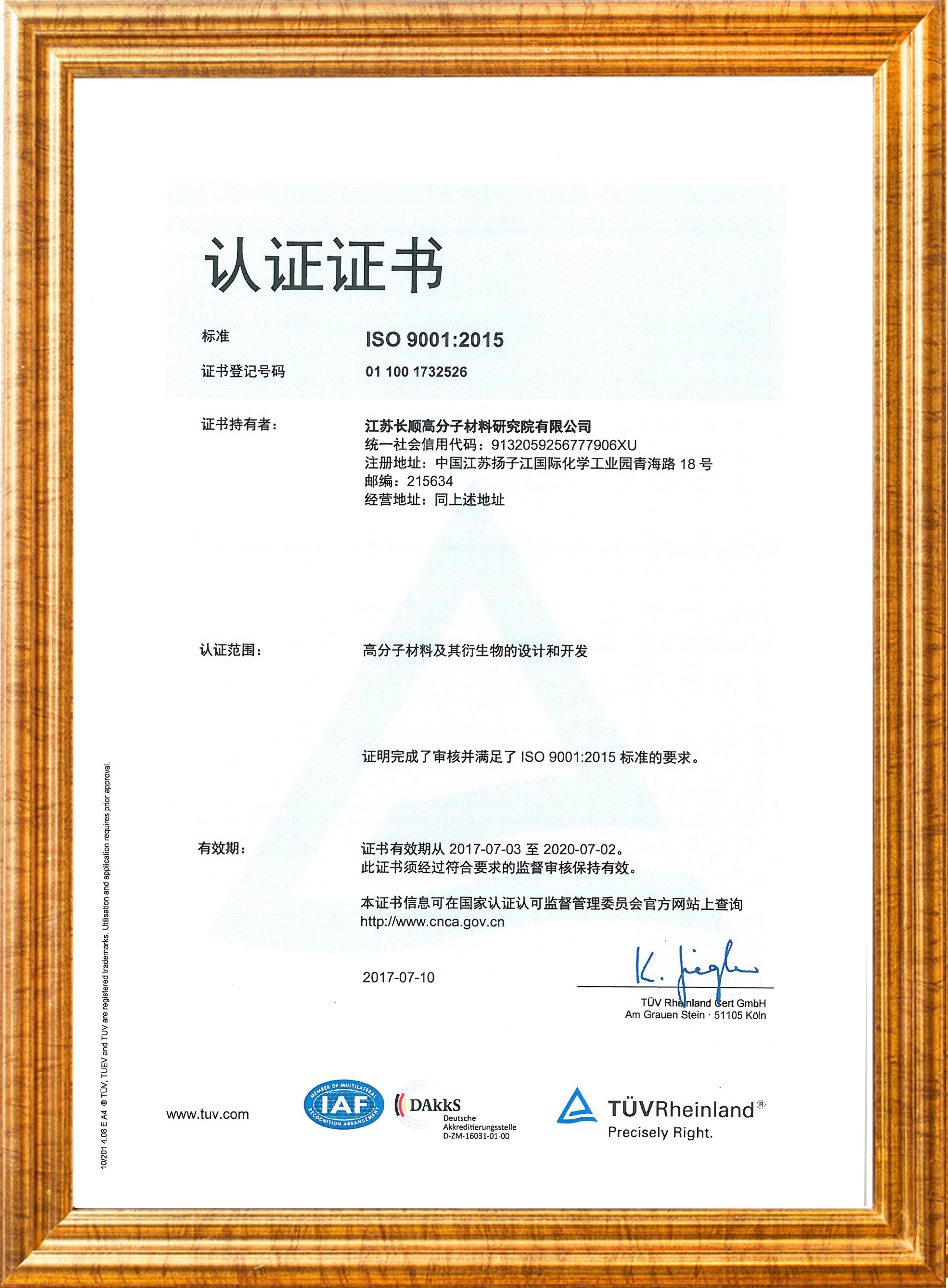 熱烈祝賀江蘇長順高分子材料研究院有限公司順利通過ISO9001:2015質量管理體系認證