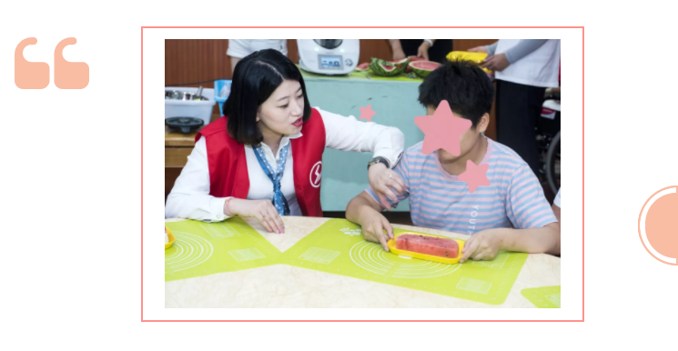 在開課前,先一起來分享下西瓜,夏季孩子們都喜歡的水果,在志愿者的幫助下,用有造型的模具刻出各種形狀的西瓜塊。