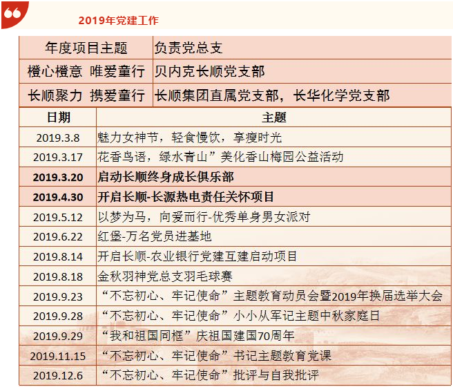 2020年貝內克-長順黨支部的重點黨建項目,通過啟動黨員亮身份,模范創先鋒。加強黨內關懷幫扶,激發黨員榮譽感,歸屬感和使命感。